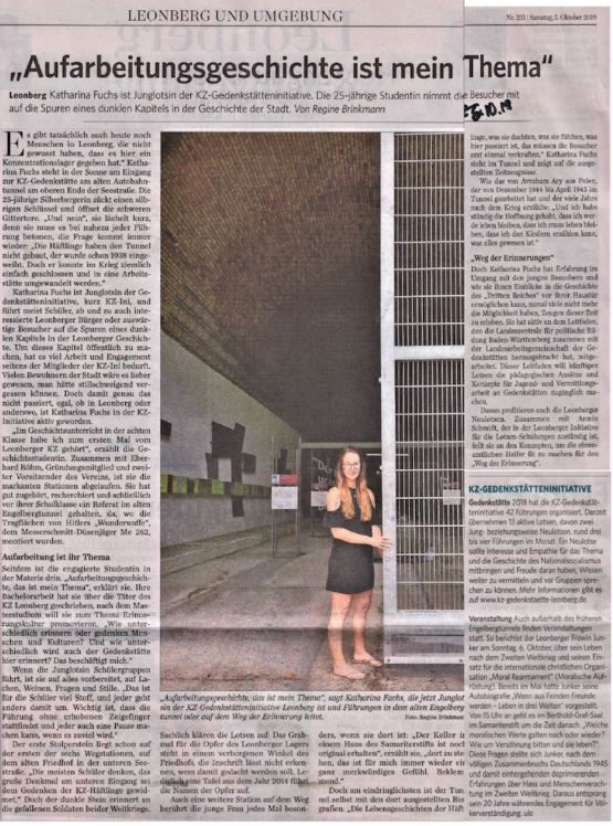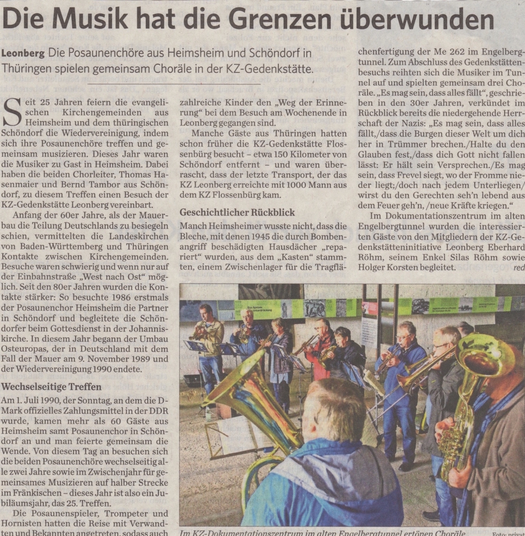 Im Oktober 2001 waren auf Einladung der Stadt ehemalige Zwangsarbeiter aus dem KZ, einige ihrer Angehörigen sowie einstige Gefangene der Gestapo nach Leonberg gekommen. Für viele dieser Männer war es das erste Mal, dass sie in jene Stadt zurückkehrten, in der sie für den deutschen Traum vom Endsieg fast zu Tode gequält worden waren - als Zwangsarbeiter von Messerschmitt, die im alten Engelbergtunnel Tragflächen für den Düsenjäger Me 262 herstellen mussten.