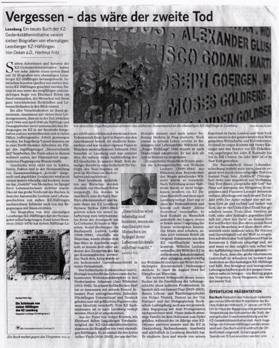 Zwei Jahre lang haben die acht Mitglieder der Geschichtswerkstatt "KZ Leonberg" in Archiven recherchiert. Sie befragten Zeitzeugen in Deutschland und im Ausland. Entstanden ist daraus ein mehr als 460 Seiten starkes Werk, "Konzentrationslager und Zwangsarbeit in Leonberg". Die Autorengruppe um den ehemaligen Pfarrer Eberhard Röhm hat nun "in Anerkennung der herausragenden Leistungen für die Heimatforschung" bei der Verleihung des 21. Landespreises für Heimatforschung eine Urkunde erhalten.