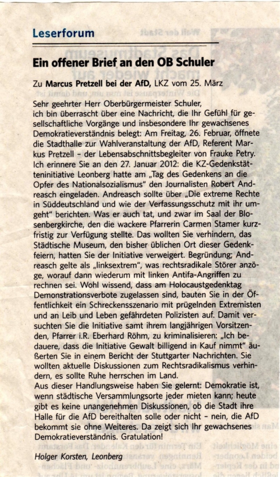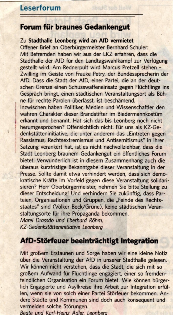 Artikel der Leonberger Kreiszeitung zur Kundgebung anlässlich der AfD-Wahlkampfveranstaltung in der Stadthalle
